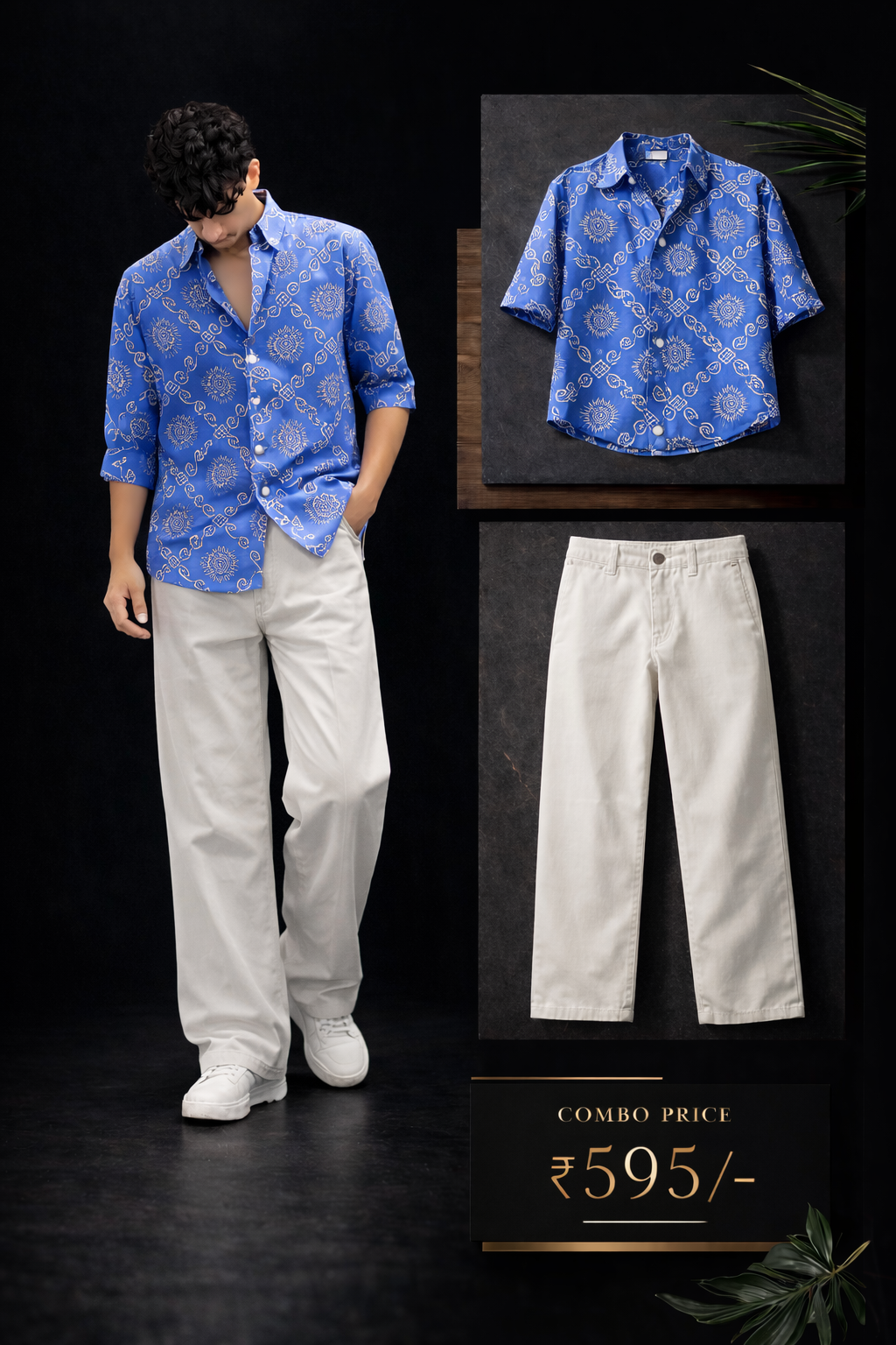 Enhance your style with this premium men’s combo set featuring a vibrant blue printed shirt paired with elegant off-white trousers. Designed for modern men who love stylish and refreshing outfits, this combo is perfect for casual outings, vacations, and summer wear.